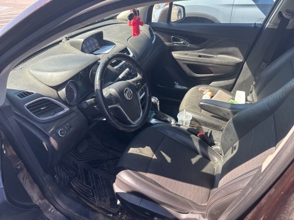 This 2015 Buick Encore comes equipped with Preferred Equipment Group 1SD (120-Volt Power Outlet, Auto-Dimming Inside Rear-View Mirror, Dual-Zone Automatic Climate Control, Front Fog Lamps, Rear Cross-Traffic Alert, Remote Vehicle Starter System, and Side Blind Zone Alert), 2-Way Manual Front Passenger Seat Adjuster, 3.53 Final Drive Axle Ratio, 4-Wheel Disc Brakes, 6 Speakers, 6-Way Power Driver Seat Adjuster, ABS brakes, Air Conditioning, Alloy wheels, AM/FM radio: SiriusXM, Auto-dimming Rear-View mirror, Automatic temperature control, Brake assist, Bumpers: body-color, CD player, Compass, Delay-off headlights, Driver door bin, Driver vanity mirror, Driver's Seat Mounted Armrest, Dual front impact airbags, Dual front side impact airbags, Electronic Stability Control, Emergency communication system: OnStar Directions & Connections, Exterior Parking Camera Rear, Front anti-roll bar, Front Bucket Seats, Front dual zone A/C, Front fog lights, Front License Plate Bracket, Front reading lights, Front wheel independent suspension, Fully automatic headlights, Heated door mirrors, Illuminated entry, Knee airbag, Leather steering wheel, Low tire pressure warning, Occupant sensing airbag, Outside temperature display, Overhead airbag, Panic alarm, Passenger door bin, Passenger vanity mirror, Power door mirrors, Power driver seat, Power steering, Power Tilt-Sliding Moonroof, Power windows, Premium audio system: IntelliLink, Radio data system, Radio: AM/FM Audio System w/MP3 CD Player, Radio: AM/FM Audio System w/Nav/Single CD Player, Rear seat center armrest, Rear side impact airbag, Rear window defroster, Rear window wiper, Remote keyless entry, Ride & Handling Suspension, Roof rack: rails only, Security system, SiriusXM Satellite Radio, Speed control, Speed-sensing steering, Split folding rear seat, Spoiler, Steering wheel mounted audio controls, Tachometer, Telescoping steering wheel, Tilt steering wheel, Traction control, Trip computer, Turn signal indicator mirrors, Upscale Cloth w/Leatherette Accents Seat Trim, Variably intermittent wipers, and Wheels: 18" 5-Spoke Painted Cast Aluminum.