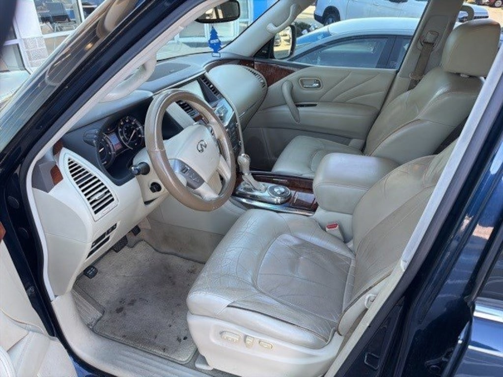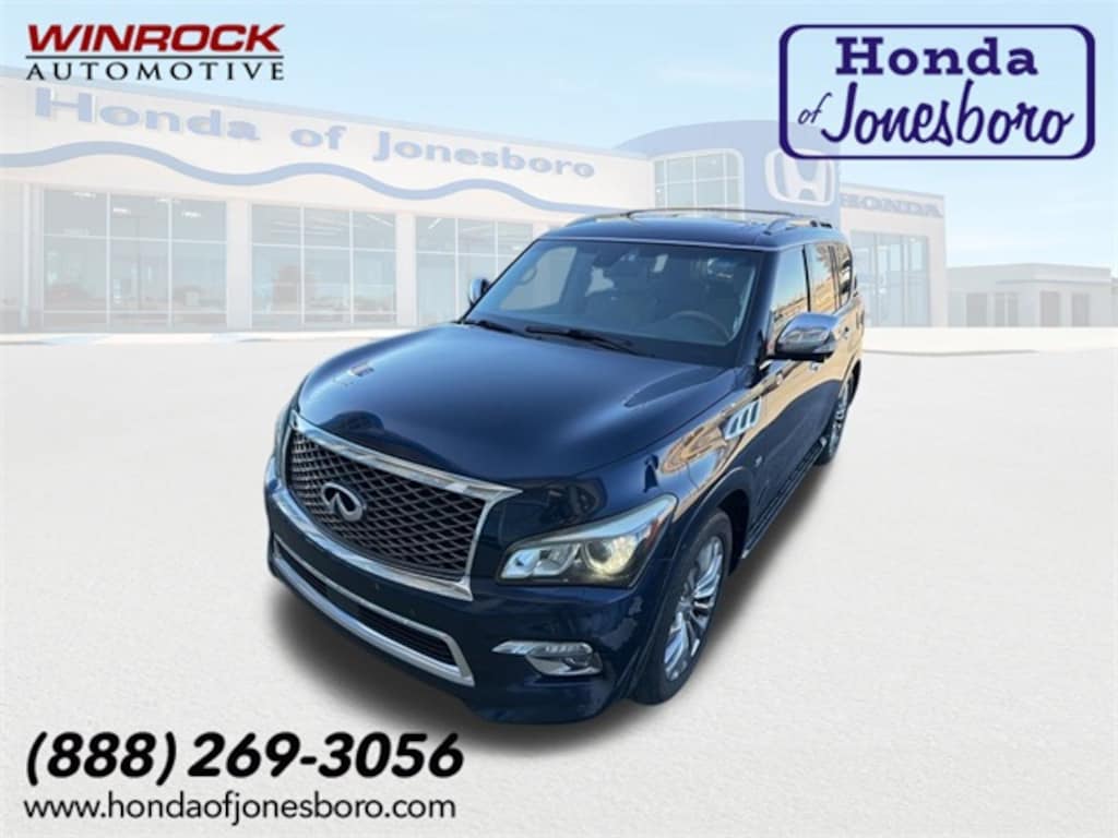 This 2015 INFINITI QX80 comes equipped with 22" Wheel Package (Wheels: 22" x 8.0" 14-Spoke Forged Aluminum-Alloy), Deluxe Technology Package (Adaptive Front Lighting System, Advanced Climate Control System, Blind Spot Intervention (BSI), Bose Cabin Surround Sound System, Chrome Mirror Caps, Climate-Controlled Front Seats, Front Pre-Crash Seatbelts, Headlight Washers, Hydraulic Body Motion Control System, Lane Departure Warning System, Semi-Aniline Leather Seating, and Stratford Burl Trim), Driver's Assistance Package (Backup Collision Intervention (BCI), Blind Spot Warning, Intelligent Brake Assist (IBA), and Intelligent Cruise Control (Full-Speed Range)), Theater Package (120V Power Outlet, Dual 7" Color Monitors, Heated 2nd-Row Seats, and Wireless Headphones (2)), 13 Speakers, 2.94 Axle Ratio, 3rd row seats: split-bench, 4-Wheel Disc Brakes, ABS brakes, Activation Disclaimer, Air Conditioning, Alloy wheels, AM/FM radio: SiriusXM, Anti-whiplash front head restraints, Auto High-beam Headlights, Auto tilt-away steering wheel, Auto-dimming door mirrors, Auto-dimming Rear-View mirror, Auto-leveling suspension, Automatic temperature control, Brake assist, Bumpers: body-color, Carpeted Cargo Mat/Cargo Net & First Aid Kit, CD player, Delay-off headlights, Driver door bin, Driver vanity mirror, Dual front impact airbags, Dual front side impact airbags, Electronic Stability Control, Emergency communication system: INFINITI Connection, Four wheel independent suspension, Front anti-roll bar, Front Bucket Seats, Front Center Armrest, Front dual zone A/C, Front fog lights, Front reading lights, Fully automatic headlights, Garage door transmitter: HomeLink, Genuine wood console insert, Genuine wood dashboard insert, Genuine wood door panel insert, Heated door mirrors, Heated Front Bucket Seats, Heated front seats, Heated steering wheel, Illuminated entry, Illuminated Kick Plates, Leather Shift Knob, Leather steering wheel, Leather-Appointed Seats w/Mocha Burl Trim, Literature Kit, Low tire pressure warning, Memory seat, Navigation System, Occupant sensing airbag, Outside temperature display, Overhead airbag, Overhead console, Panic alarm, Passenger door bin, Passenger vanity mirror, Power door mirrors, Power driver seat, Power Liftgate, Power moonroof, Power passenger seat, Power steering, Power windows, Radio data system, Radio: Bose Premium Sound System w/Navigation, Rain sensing wipers, Rear air conditioning, Rear anti-roll bar, Rear audio controls, Rear reading lights, Rear seat center armrest, Rear window defroster, Rear window wiper, Reclining 3rd row seat, Remote keyless entry, Roof rack: rails only, Roof Rail Crossbars, Security system, Speed control, Speed-sensing steering, Split folding rear seat, Spoiler, Steering wheel memory, Steering wheel mounted audio controls, Tachometer, Telescoping steering wheel, Tilt steering wheel, Traction control, Trip computer, Turn signal indicator mirrors, Variably intermittent wipers, Voltmeter, and Wheels: 20" Split 6-Spoke Aluminum-Alloy.